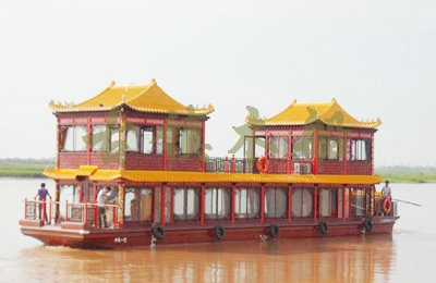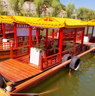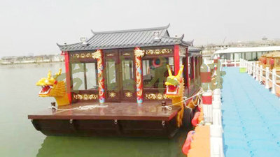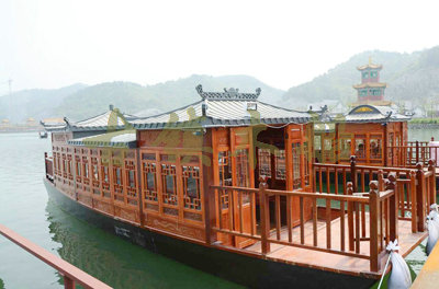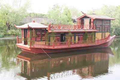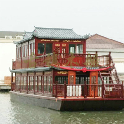 畫舫船就是裝飾古典華麗的游船,是"中國風(fēng)"的仿古游船,結(jié)合古典園林建筑,體現(xiàn)了中華文明的古典藝術(shù).畫舫船豪華而又古典,船上的建筑按照中國古代建筑里的亭臺(tái)樓閣,建筑工藝之復(fù)雜,要求之嚴(yán)格,仿古畫舫游船的特點(diǎn)飛檐翹角、玲瓏精致的四角亭子逐漸成形,赫然立于船頭,美人靠、盤龍柱子、彩畫……龍柱上的浮雕盤龍和祥云一層扣著一層,層層錯(cuò)落有致,雕刻精細(xì)到盤龍身上的每一個(gè)鱗片都細(xì)細(xì)可數(shù),古代皇家標(biāo)志性元素,在畫舫船上體現(xiàn)的淋漓盡致。除了雕刻、花窗,整條船還有一個(gè)看點(diǎn),那就是弧線優(yōu)美、高高翹起的船尾。游船并不大,長約10米、寬3米,但是整體看起來堪稱一件藝術(shù)品。船尾的雕花欄桿與船艙、船頭的雕刻遙相呼應(yīng),船身四周貼著浮雕祥云,給整條船增添了富貴、華麗的氣質(zhì)。